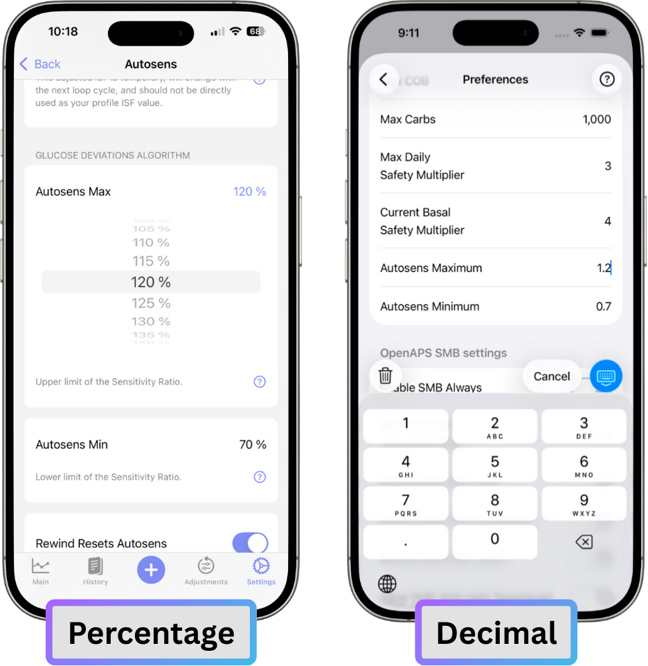 In Trio 0.2 you might set "Autosens Maximum" to 1.2. In Trio 0.5 (or higher), we show "Autosens Max" as 120%, which means the same thing, but is easier to understand.