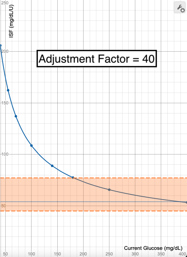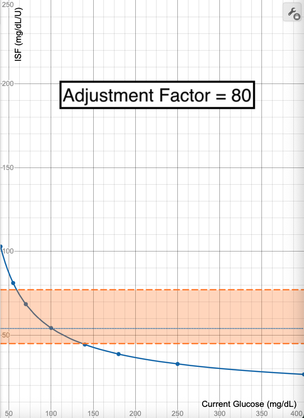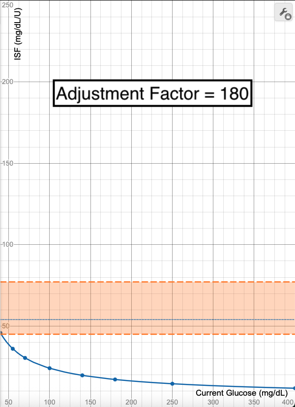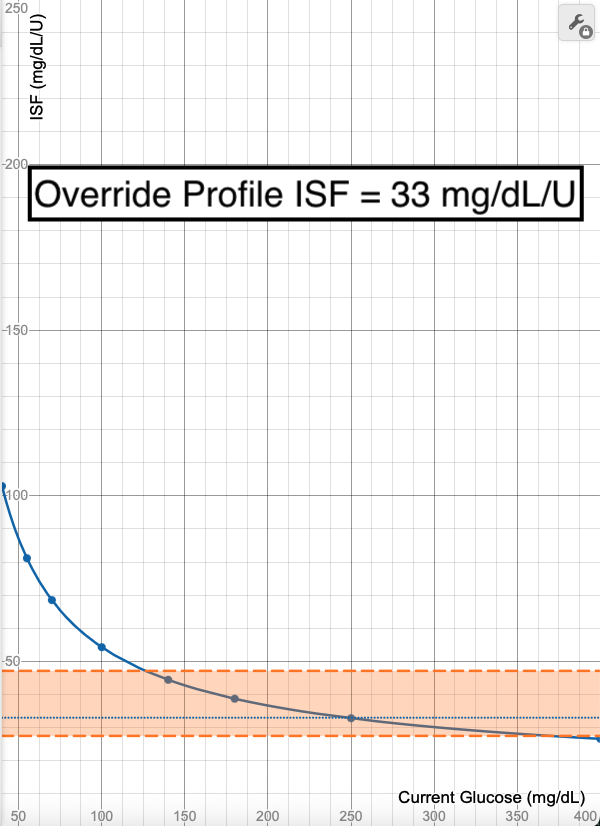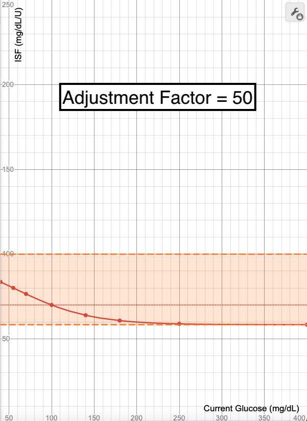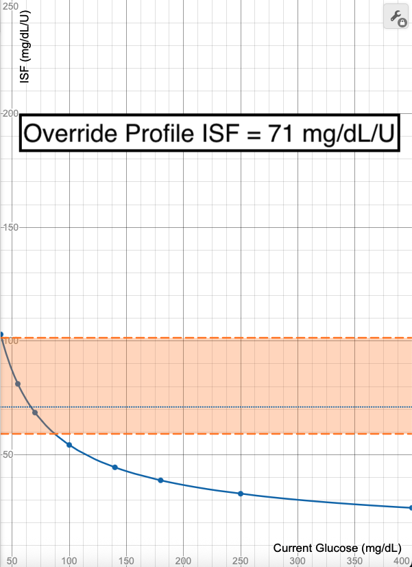 Notice how the calculated ISF line does not change with this adjustment to the Profile ISF, only the limits of what section of the curve are allowed. It shifts the limits to only allow the higher ISF portions of the graph, meaning the ISF allowable range will be 59-100 mg/dL/U and the adjustments are capped if glucose is reading higher than 87 mg/dL.