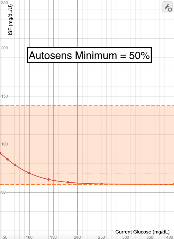Notice how Sigmoid is still locked at your Profile ISF being used when glucose is at target? And notice how there's a significant amount of empty space at the top of the orange section in the 50% graph? This means that lowering your Autosens Minimum may not actually lower the adjustments allowed to the extent that you hope, but the only noticeable result may be the curve becoming steeper.
