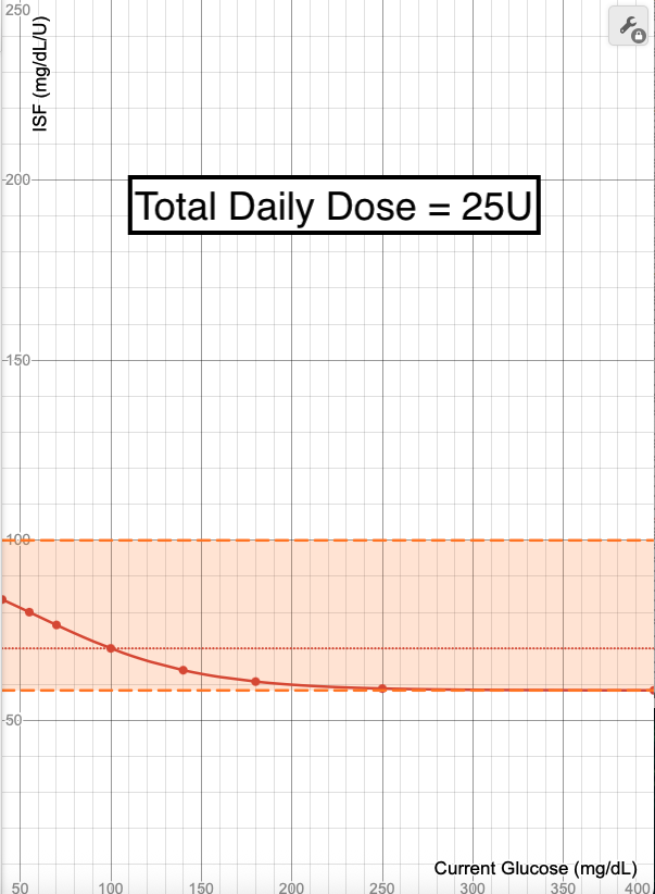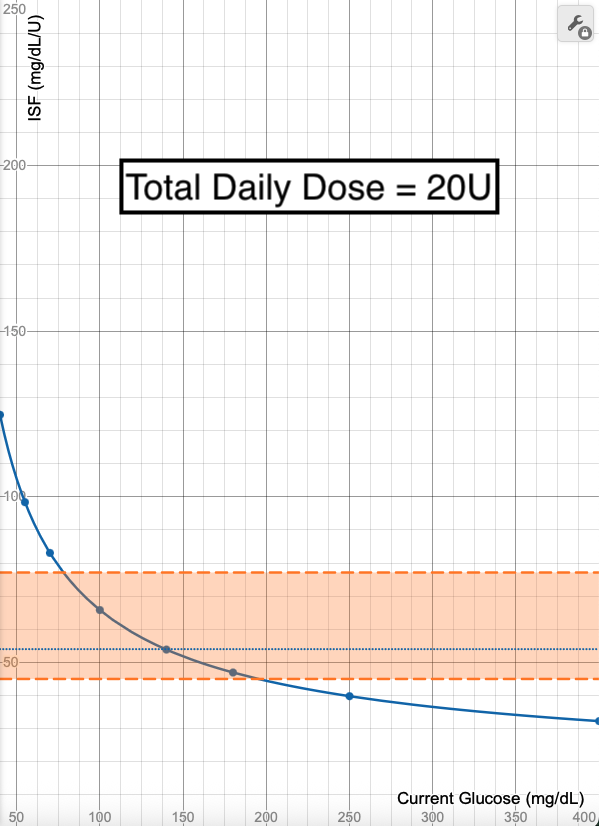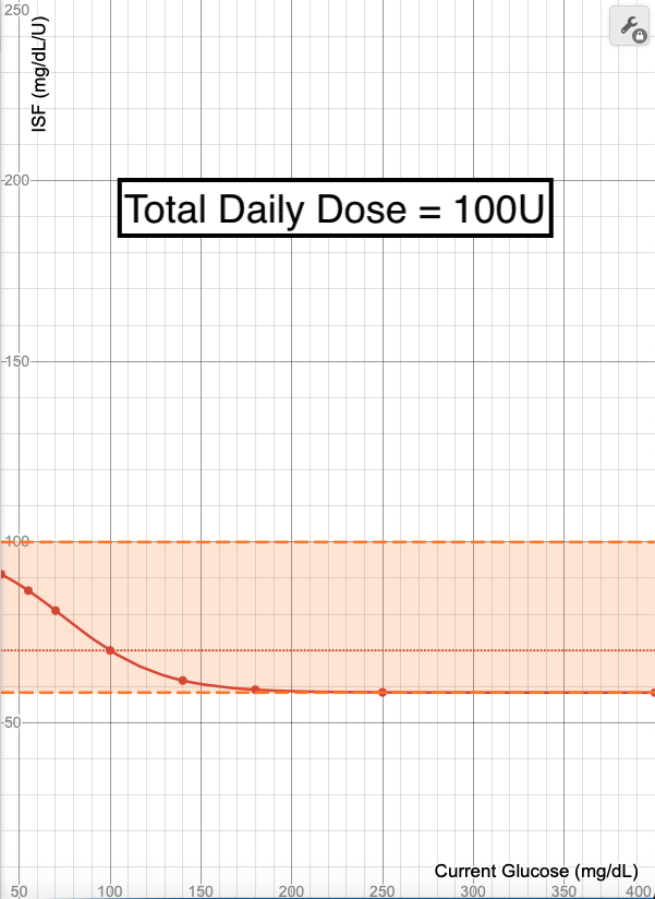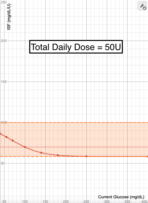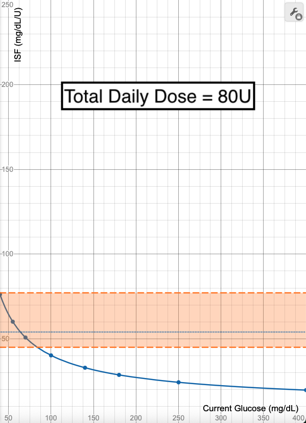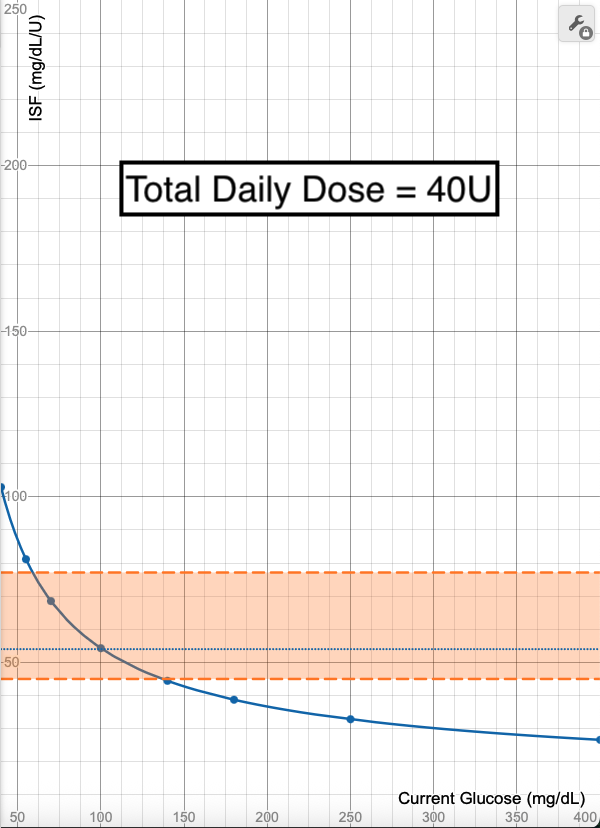 Using a Total Daily Dose (TDD) of 40 units as a baseline, you can see how this changes the ISF calculations when TDD is halved (20 units) or doubled (80 units).